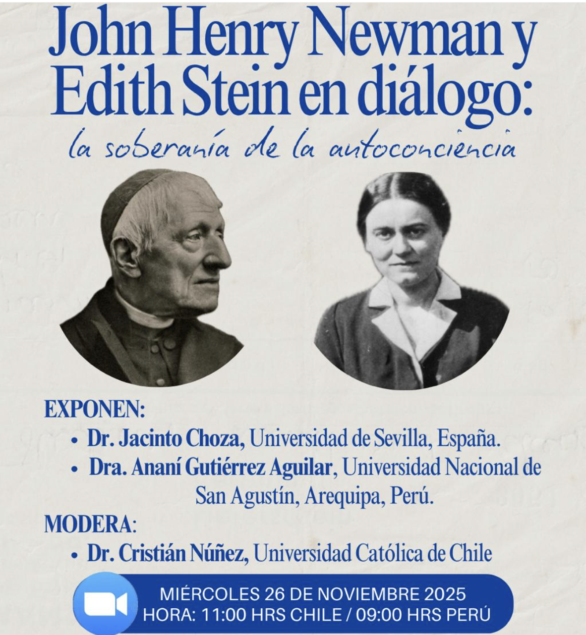 En el contexto del reciente nombramiento del Cardenal John Henry Newman como Doctor de la Iglesia, el presente conversatorio propone un espacio de reflexión en torno a su pensamiento y el de Edith Stein, dos figuras decisivas en la configuración del pensamiento cristiano contemporáneo. La reflexión se orienta a considerar la soberanía de la autoconciencia como fundamento de la dignidad y de la libertad humanas, a partir de la recepción de sus ideas en los ámbitos teológicos y eclesiásticos de la Iglesia católica.